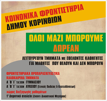 Το πρόγραμμα των δωρεάν «Κοινωνικών φροντιστηρίων» στο Δήμο Κορινθίων, υλοποιήθηκε για πρώτη φορά τη σχολική περίοδο 2011-1012, στηριζόμενο στην προσφορά των ιδιοκτητών φροντιστηρίων ξένων γλωσσών και συνταξιούχων καθηγητών μέσης εκπαίδευσης.