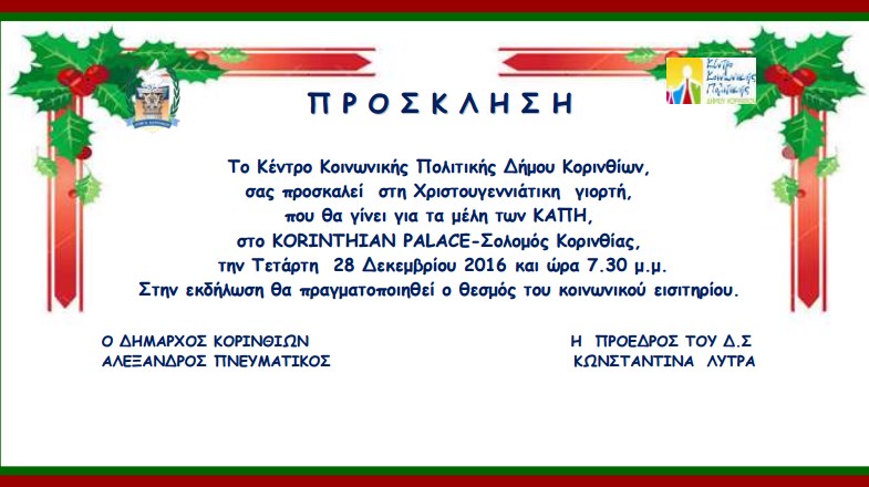 Το Κέντρο Κοινωνικής Πολιτικής του Δήμου Κορινθίων διοργανώνει Χριστουγεννιάτικη Γιορτή για τα μέλη των 13 ΚΑΠΗ την Τετάρτη 28 Δεκεμβρίου στις 7.30 το απόγευμα στο Korinthian Palace.