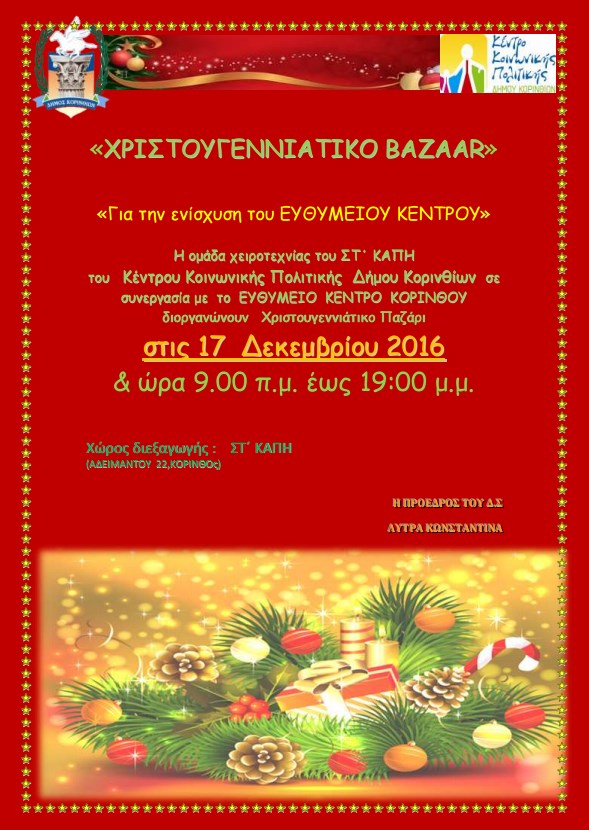 Η ομάδα χειροτεχνίας του ΣΤ΄ ΚΑΠΗ του Κέντρου Κοινωνικής Πολιτικής Δήμου Κορινθίων σε συνεργασία με το ΕΥΘΥΜΕΙΟ ΚΕΝΤΡΟ ΚΟΡΙΝΘΟΥ διοργανώνουν Χριστουγεννιάτικο Παζάρι στις 17 Δεκεμβρίου 2016 & ώρα 9.00 π.μ. έως 19:00 μ.μ. στο ΣΤ΄ ΚΑΠΗ (ΑΔΕΙΜΑΝΤΟΥ 22, ΣΤΗΝ ΚΟΡΙΝΘΟ)